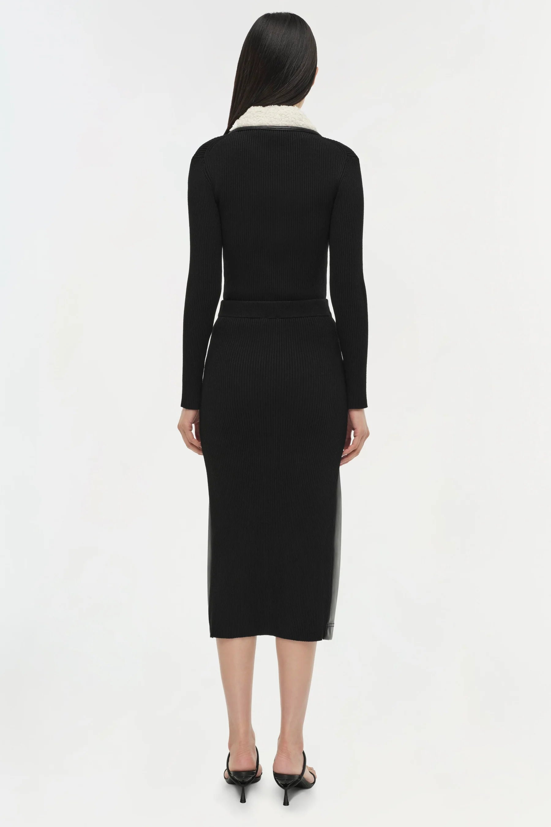 This sleek midi features a high-waisted fit and a front zipper detail. Its fitted silhouette and contemporary design of faux leather in the front and compact knit in the back make it a standout piece for any wardrobe.